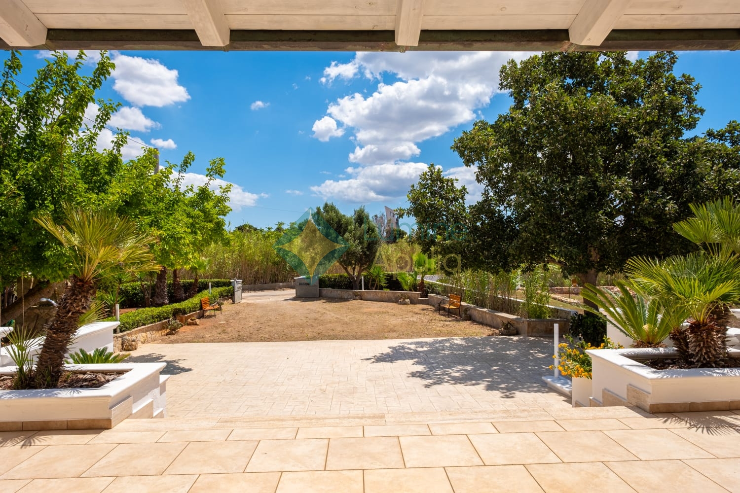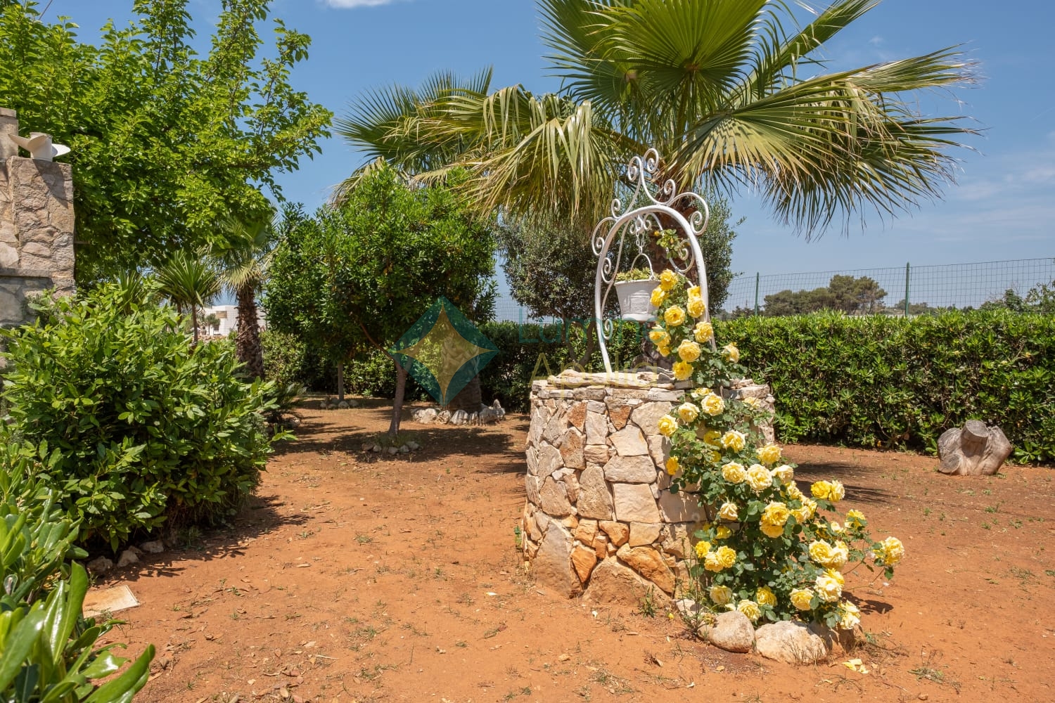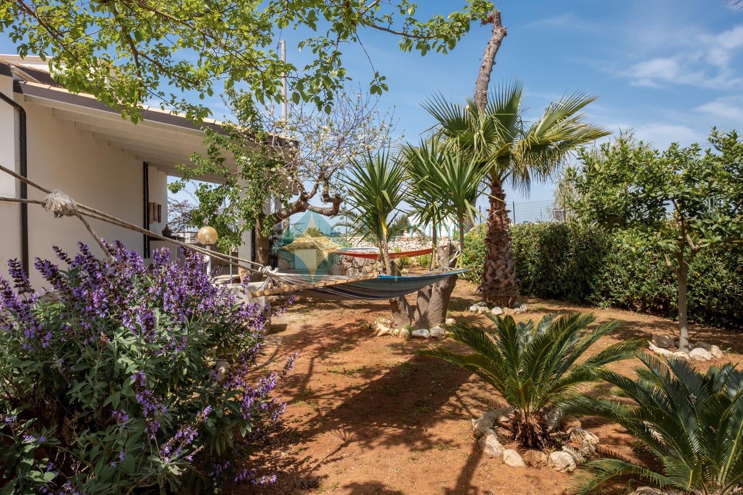 - un giardino rigoglioso con alberi e piante mediterranee che regalano privacy e ombra naturale.