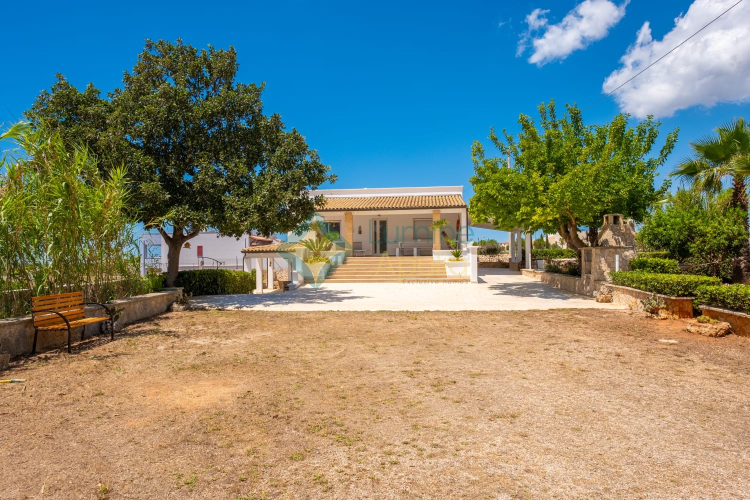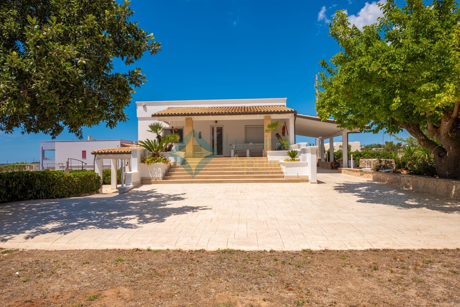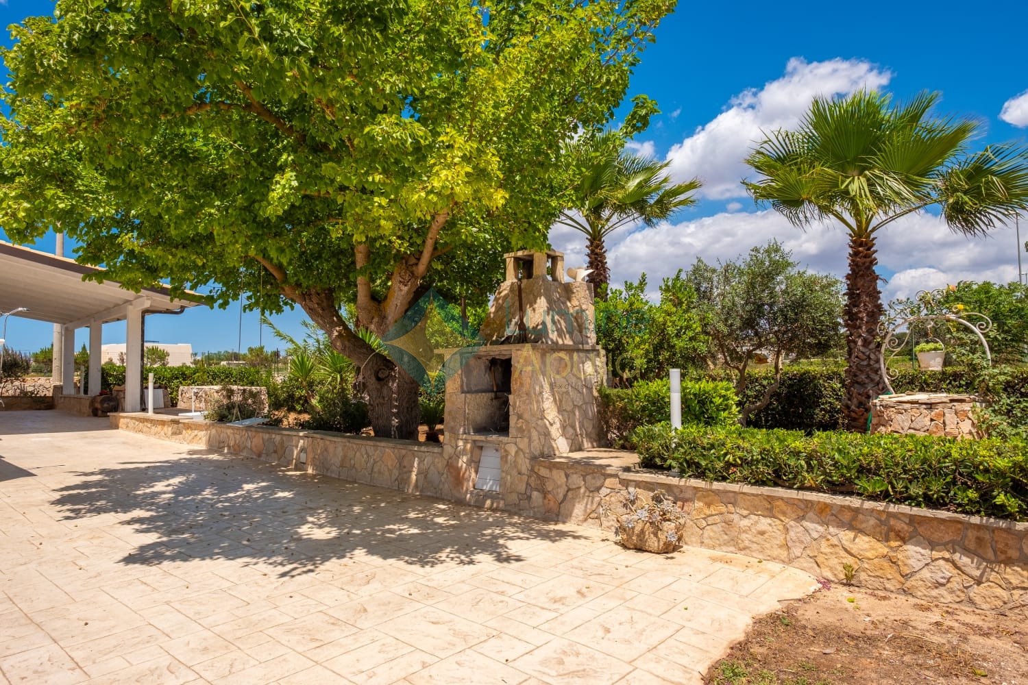- un giardino rigoglioso con alberi e piante mediterranee che regalano privacy e ombra naturale.